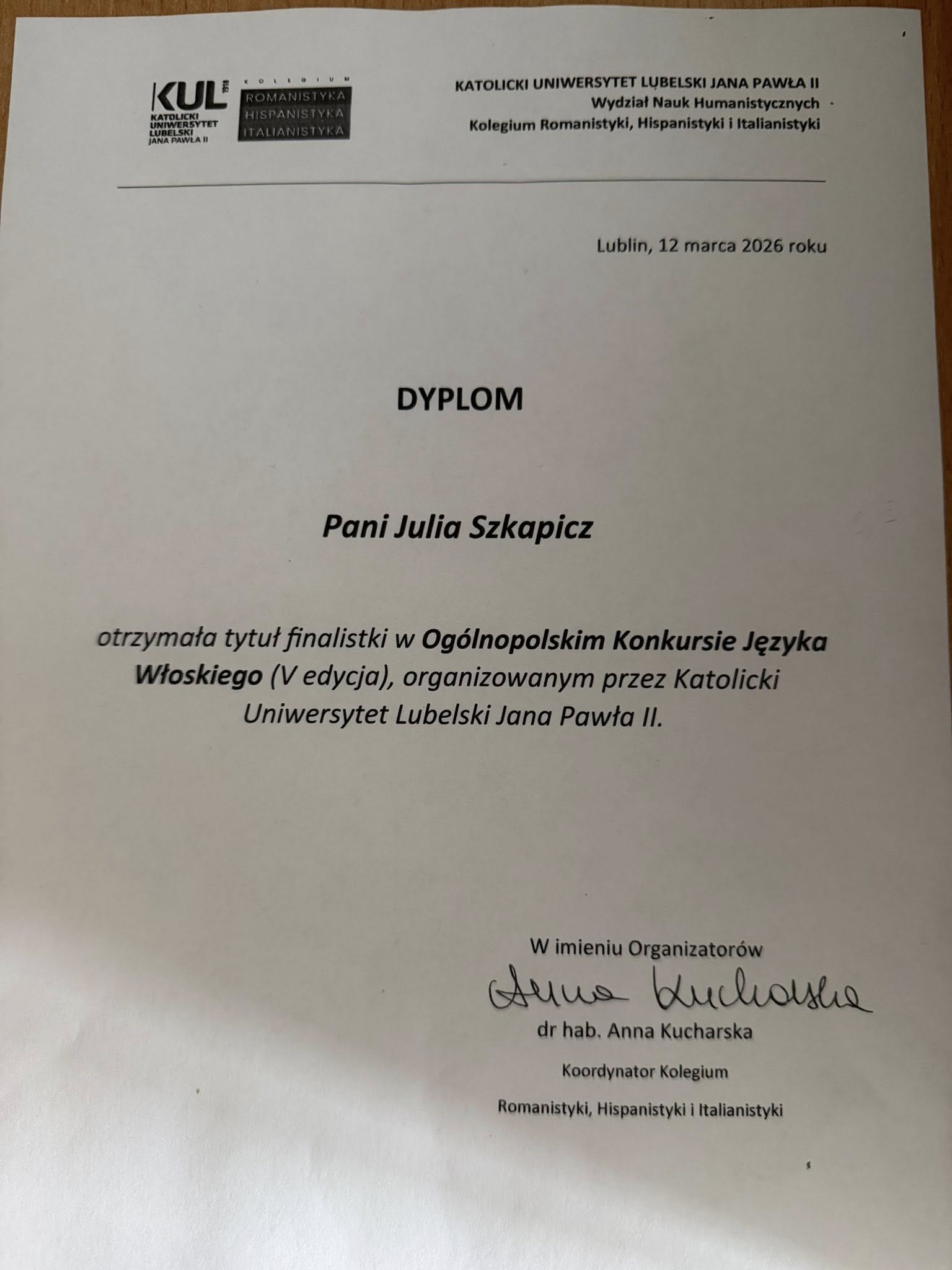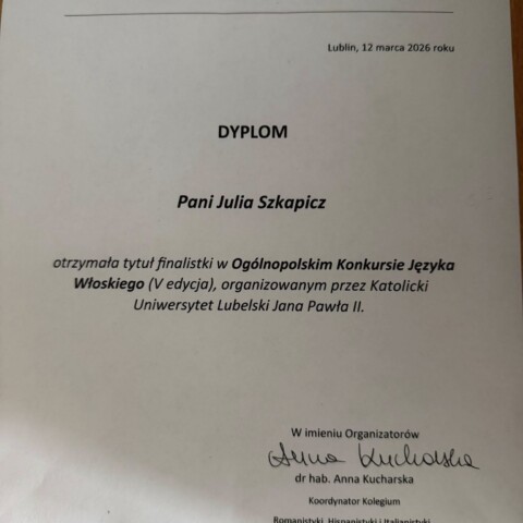 Z dumą informujemy, że Julia Szkapicz z klasy 3E została finalistką V edycji Ogólnopolskiego Konkursu Języka Włoskiego, organizowanego przez Katolicki Uniwersytet Lubelski Jana Pawła II.